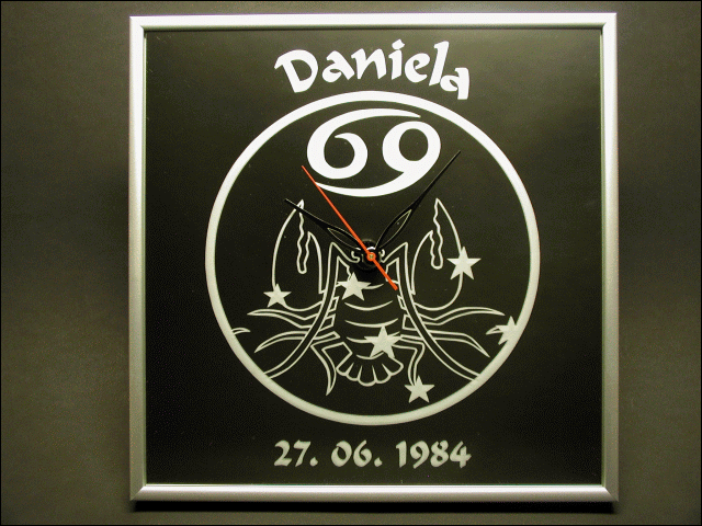 Motiv Krebs mit Uhr und Widmung Motiv 34.- Text 10.- Uhr 25.- Rahmen 35.- = Summe Fr. 104.-